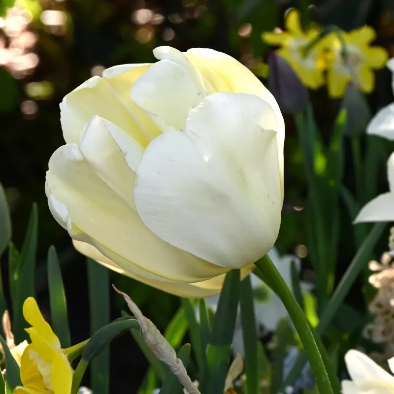 Opis: Močan, velik Darwinov tulipan s slonokoščenobelimi cvetovi.