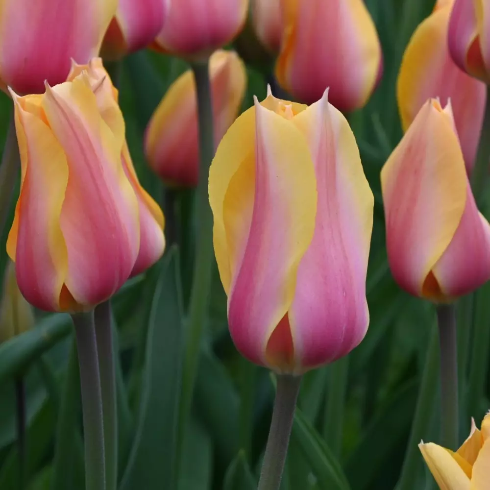 Opis: Eleganten tulipan z nekoliko špičastimi cvetovi, ki mu dajejo pridih lilijastega tulipana. Barva cvetov je kombinacija nežno rumenih in nežno rožnatih odtenkov.«.