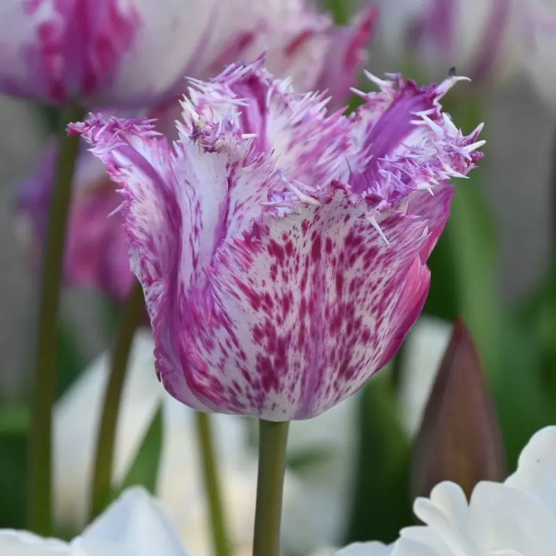 Opis: Resasti beli tulipan, ki med cvetenjem postopoma postaja vse bolj vijoličast.