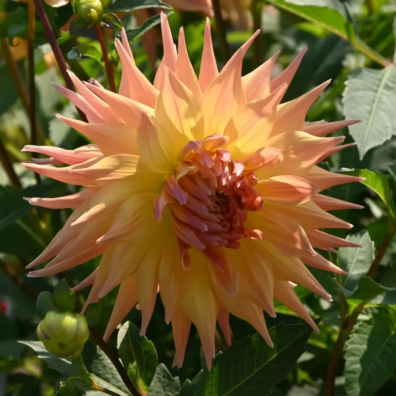 Opis: Kaktusasta dalija z velikimi, elegantnimi cvetovi marelične barve. Velikost cvetov je 20 cm.