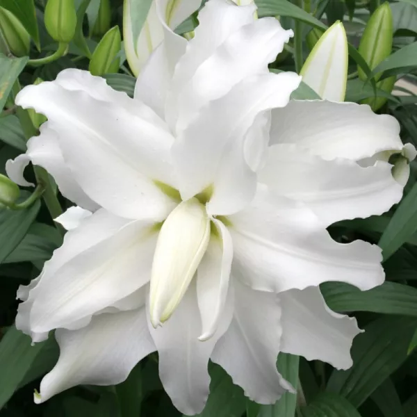 Opis: Orientalska lilija z velikimi belimi polnjenimi cvetovi.