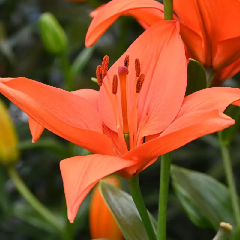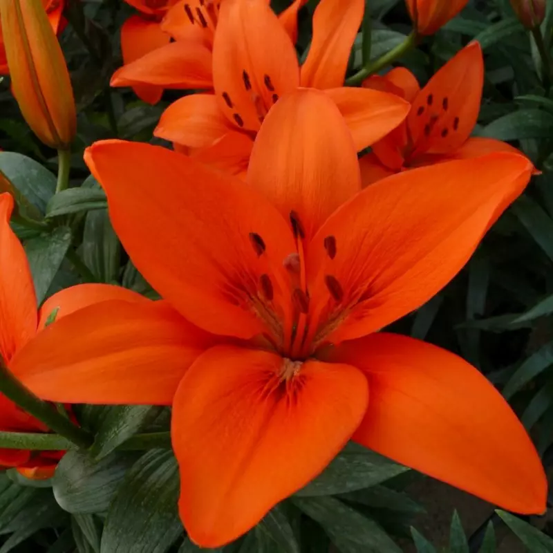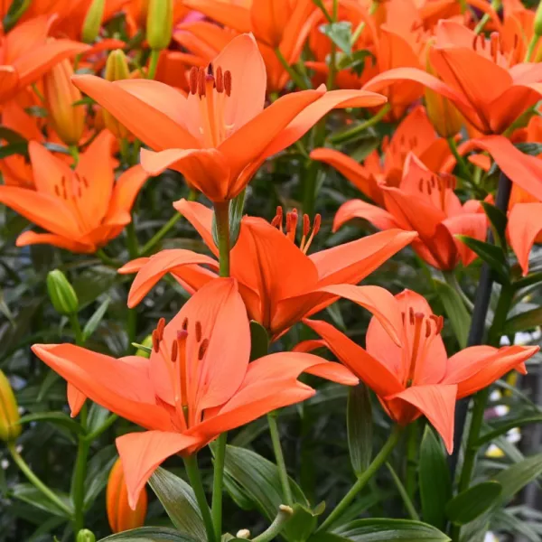 Opis: Azijska lilija z navpično rastočimi oranžnimi cvetovi, brez vonja.