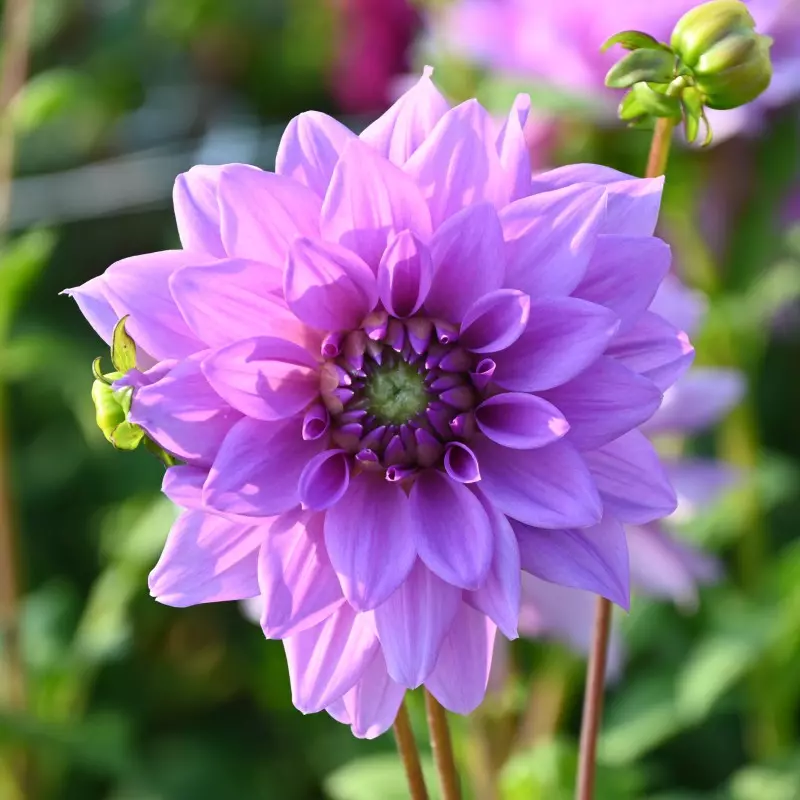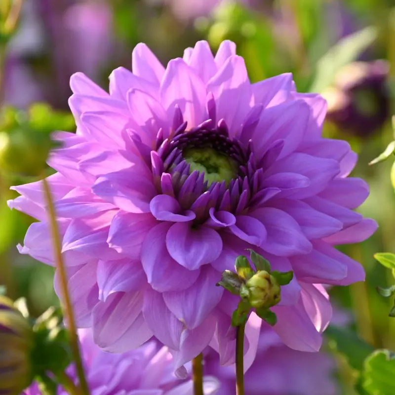 Opis: Dekorativna dalija z lila-vijoličnimi cvetovi. Velikost cveta 12 cm.