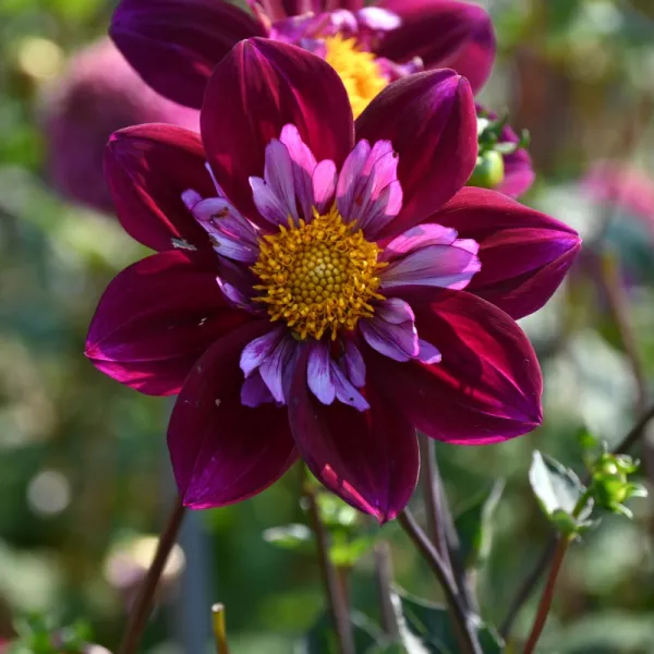 Opis: Čudovita kolaretna dalija z enojnim vijolično-rdečim cvetom in rožnato-belim ovratnikom okoli rumenega središča. Velikost cveta 11 cm.