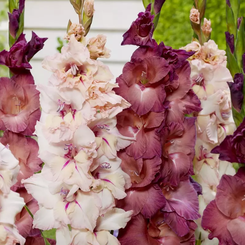 Opis: Čudovita mešanica slivovo rdečih in nežno rožnatih gladiol. Popolna izbira za rezano cvetje. Rast ustvarja čudovite navpične poudarke v cvetlični gredi.