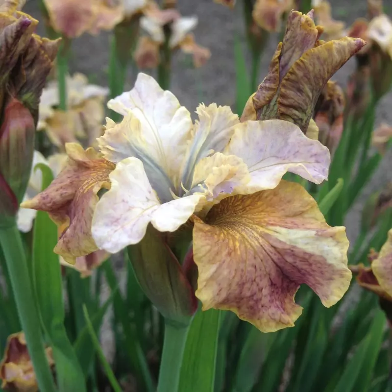 Opis: Sibirska perunika, trajnica. Enostavna za gojenje, primerna tako za bolj suha kot tudi vlažna tla. Cvetni listi so v različnih odtenkih nežne marelične barve z rdeče-vijoličnimi žilami, pokončni notranji cvetni listi so kremne barve z zlato rumenim odtenkom. Barva lahko nekoliko variira.