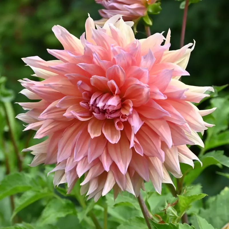 Opis: Dekorativna dalija v oranžni barvi z odtenki staro rožnate in zlato rumene. Velikost cveta: 20 cm.